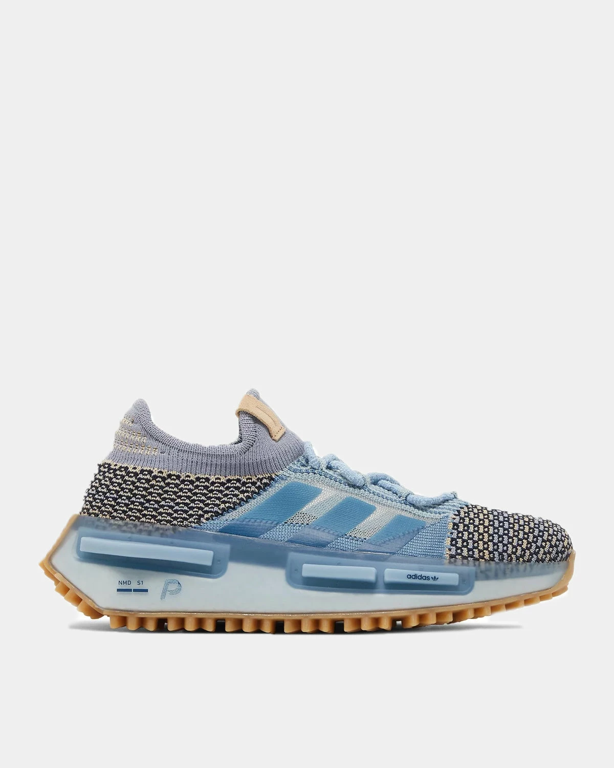 The Philllllthy x NMD_S1 ‘Ambient Sky’ delivers the sneaker customizer’s take on the stripped-down lifestyle runner. The sock-like knit upper features a black-and-white woven pattern with a stretchy grey collar and vibrant blue three-stripes on the quarter panel. Lightweight cushioning is provided by a full-length Boost midsole, enveloped in a semi-translucent cage with a trio of NMD plugs embedded in the lateral sidewall. The lateral heel is marked with ‘NMD S1’ and Philllllthy’s ‘P’ logo. Underfoot, a tan rubber outsole utilizes a lugged traction pattern made up of raised adidas Trefoils.