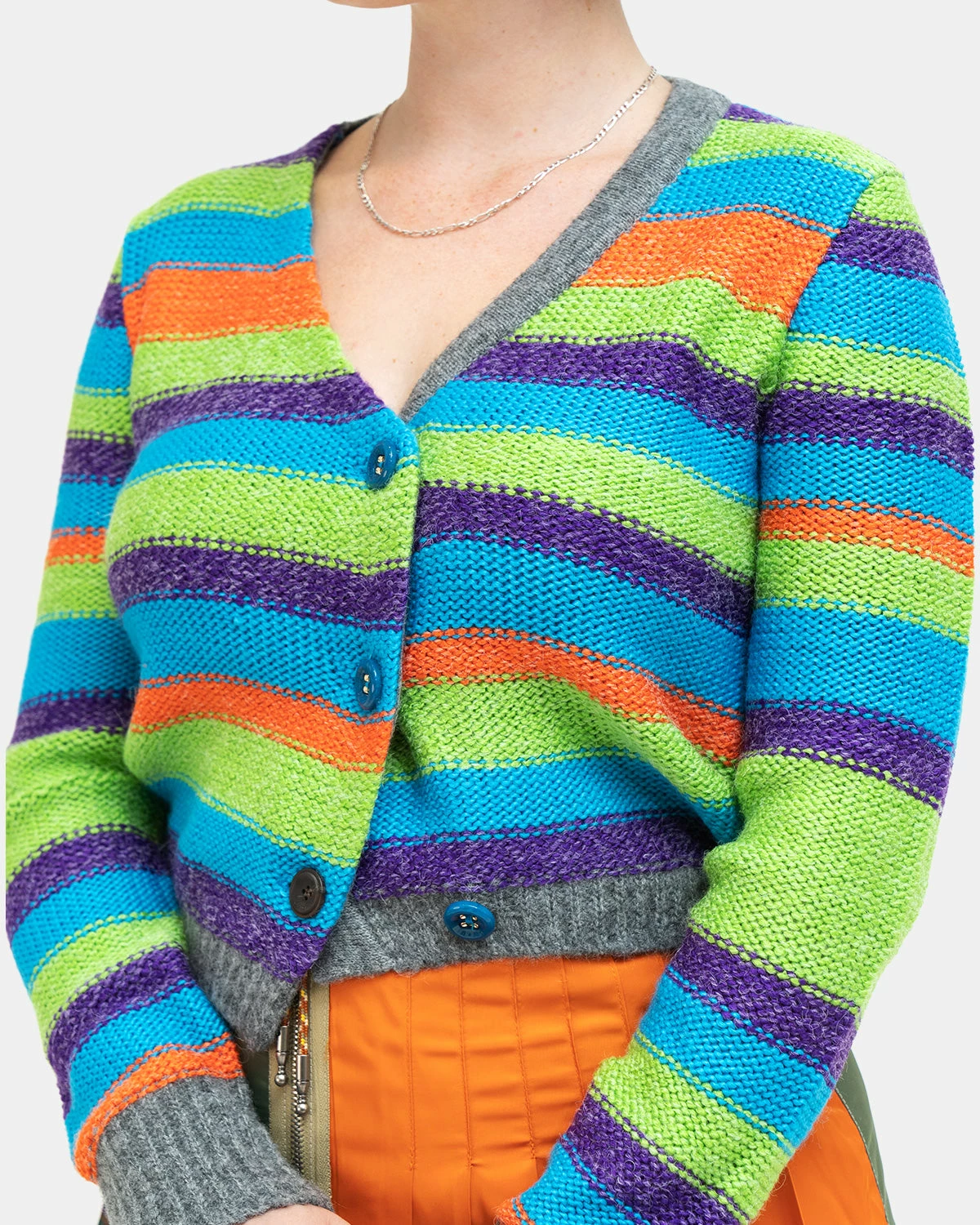 Drawing inspiration from Scandi staples, it offers classic V-neck cardigan with a twist. It’s covered in multicoloured stripes and has an asymmetric button closure.