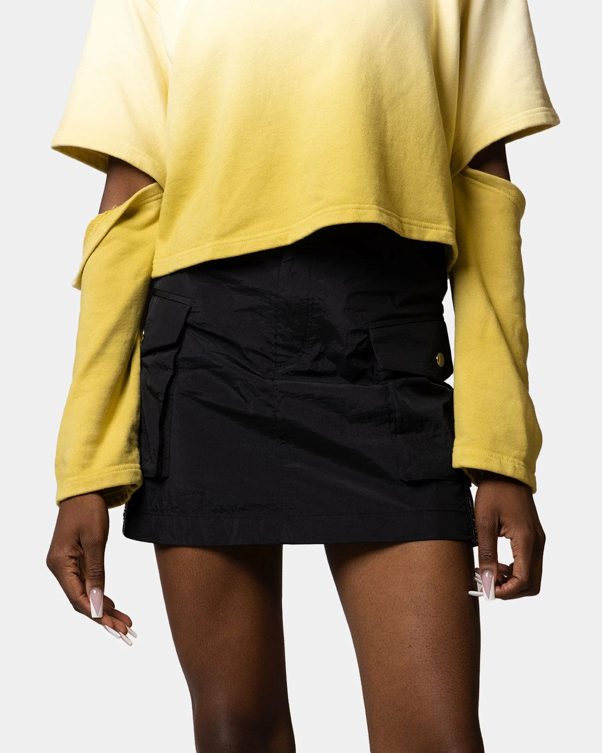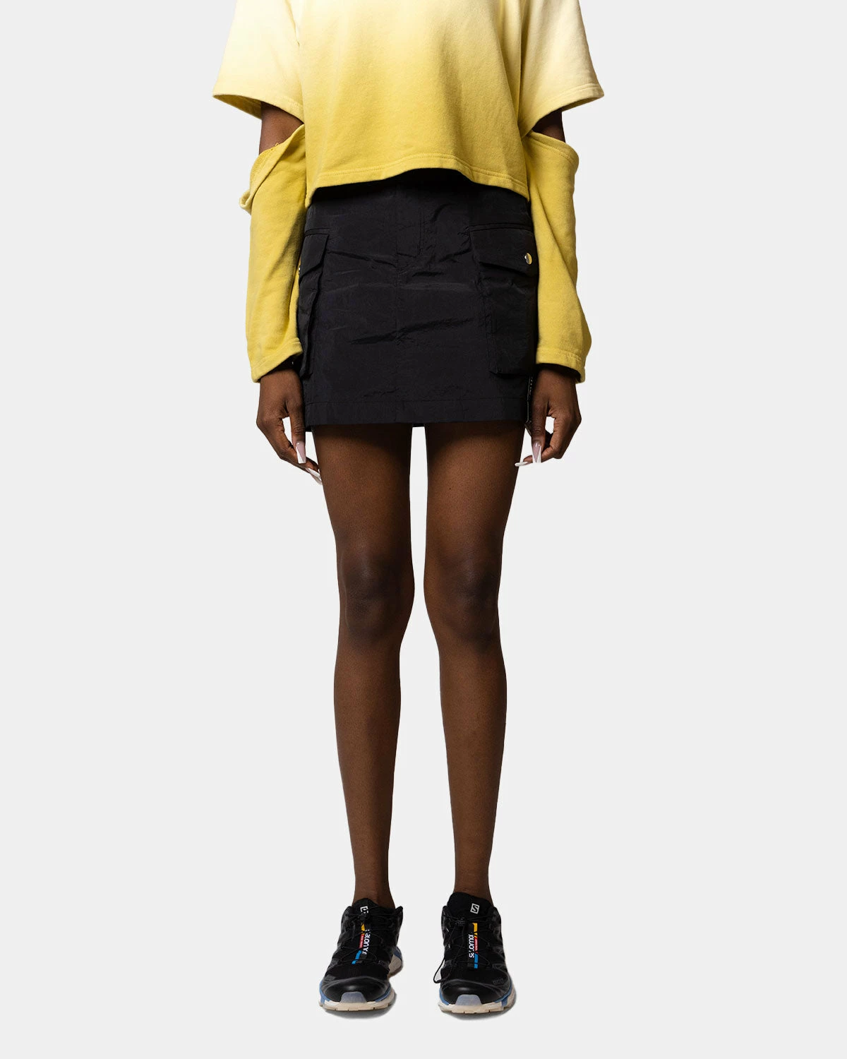A mini skirt that can be worn sporty or casual. Features a cargo design and logo tape on the side. With lining so you don’t have to worry about it being see-through. We also recommend the silicone patch jogger pants that use the same material!