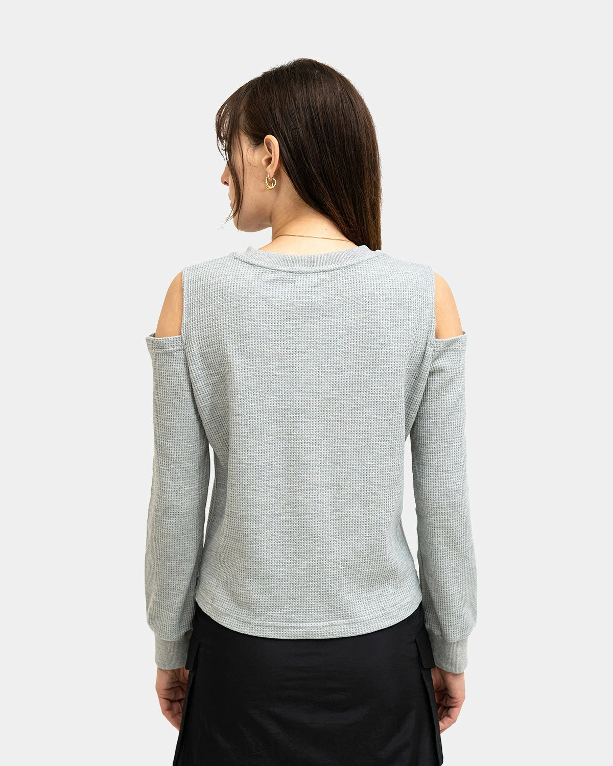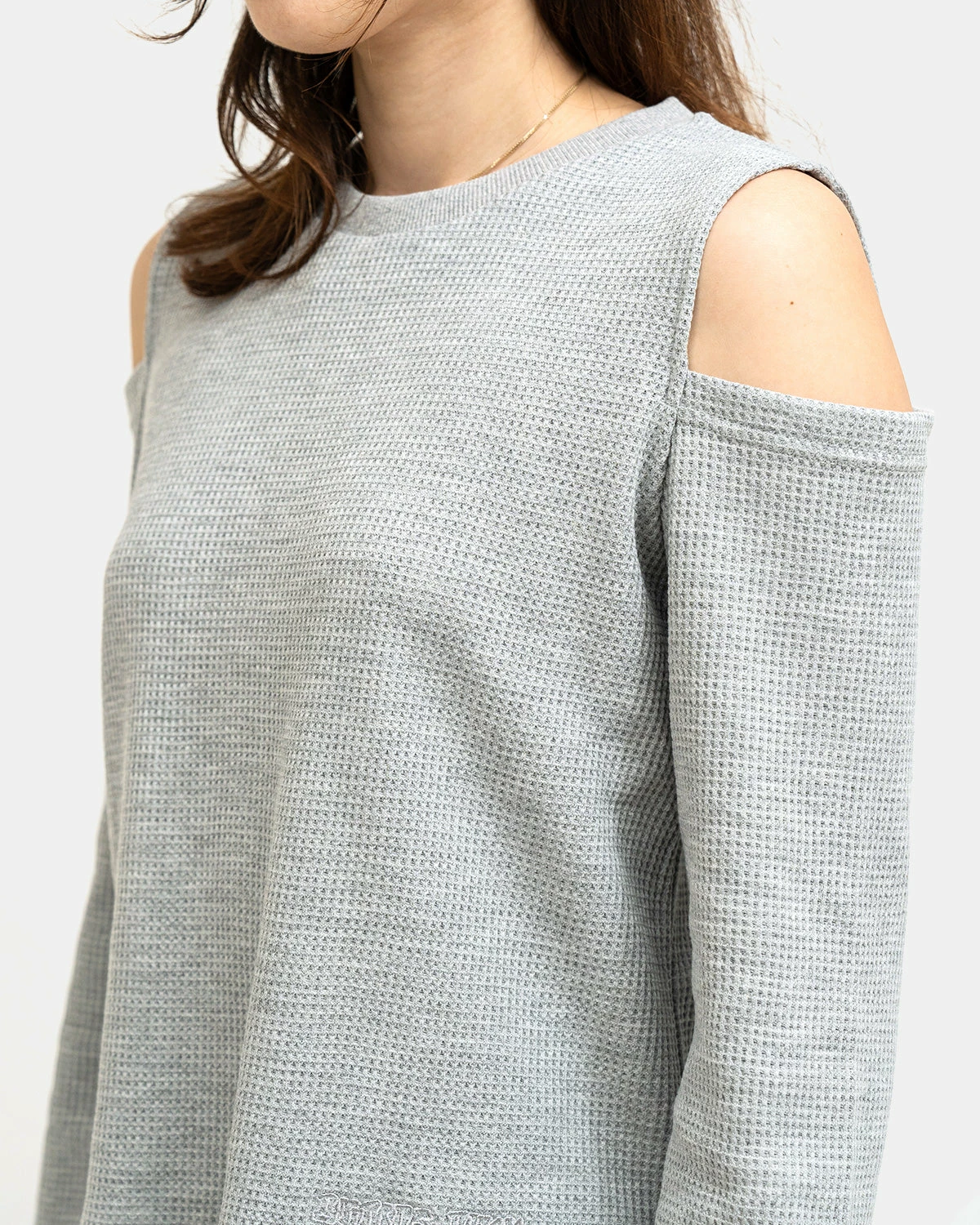 Open-shoulder top made of soft waffle material. Slightly narrow width and open shoulders for a lady-like silhouette. A recommended item that is easy to mix and match due to its simple design!