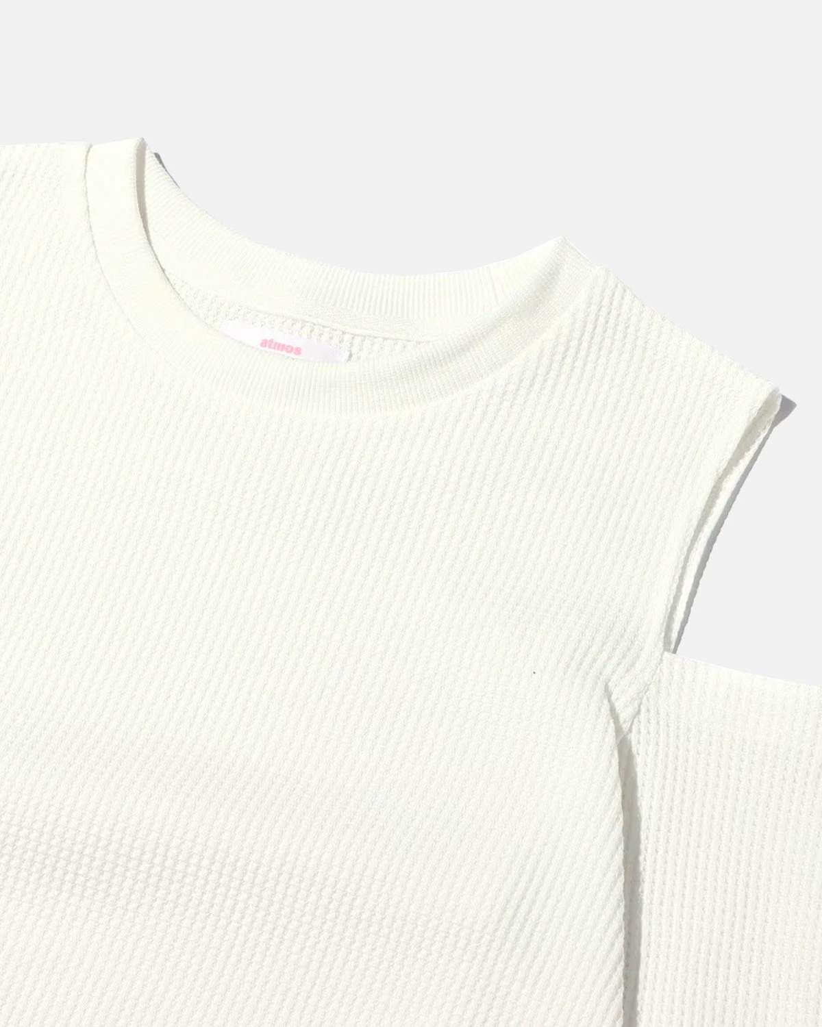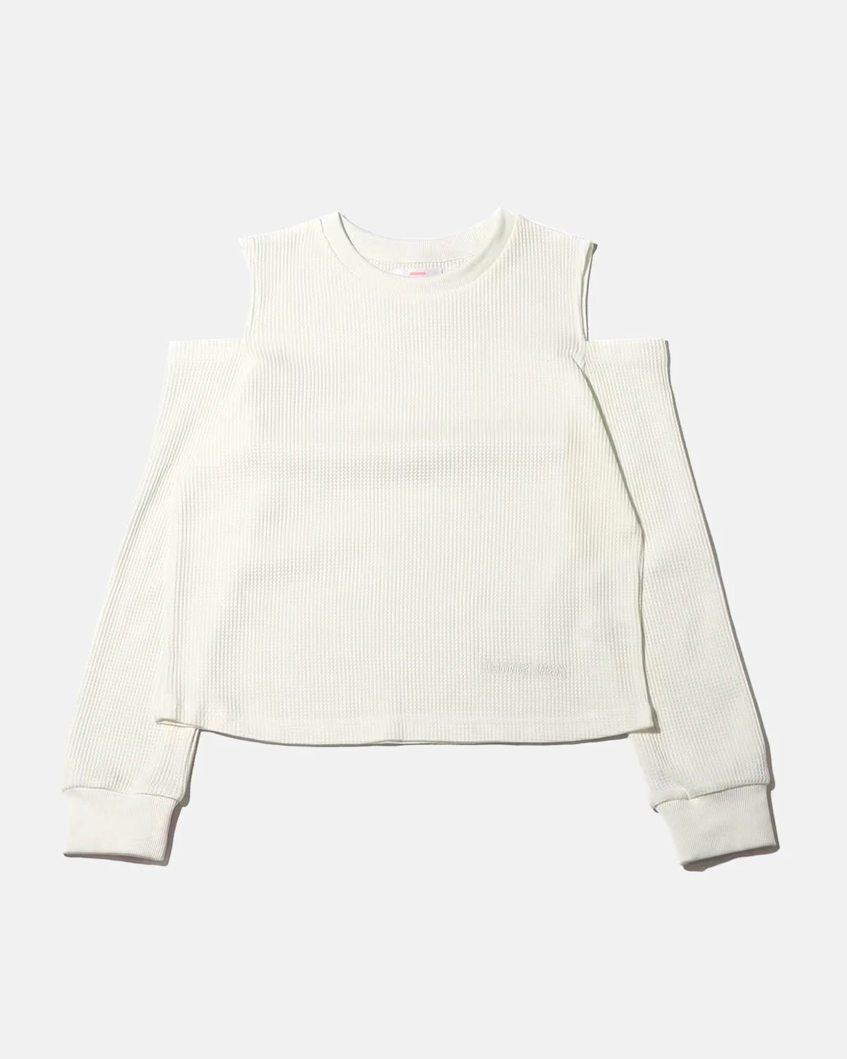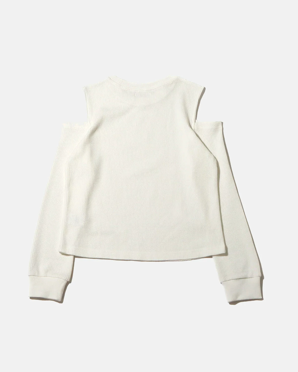 Open-shoulder top made of soft waffle material. Slightly narrow width and open shoulders for a lady-like silhouette. A recommended item that is easy to mix and match due to its simple design!