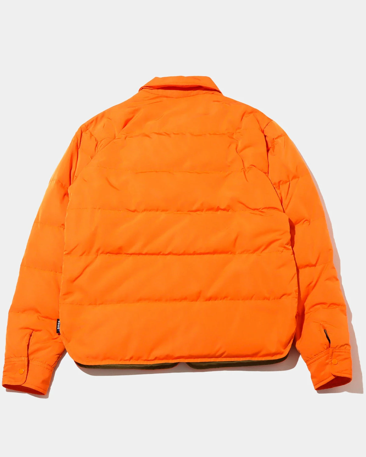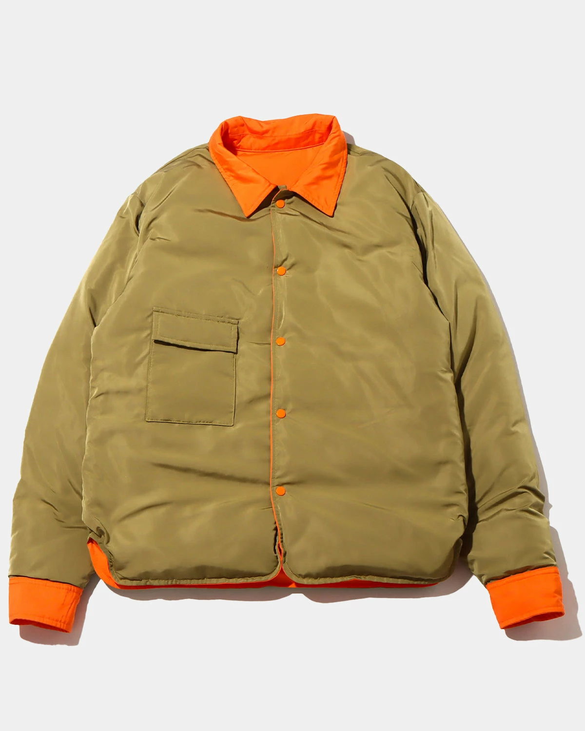 Atmos original parel 2022 Holiday Collection insulation shirt jacket. It has excellent heat retention with batting and is reversible. The surface is a single color, flap pockets with snap buttons on both chests, embroidered atmos classic logo on the left chest, and piss name on the left hem. The back side has a flap pocket with Velcro on the right chest. The collar, cuffs and buttons are colored with the surface color.