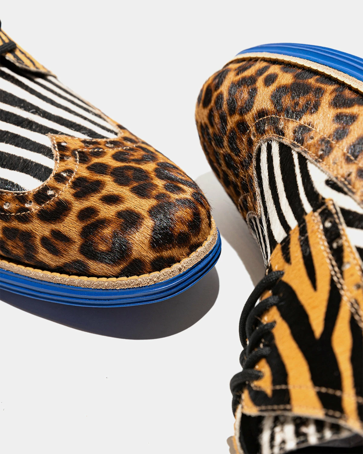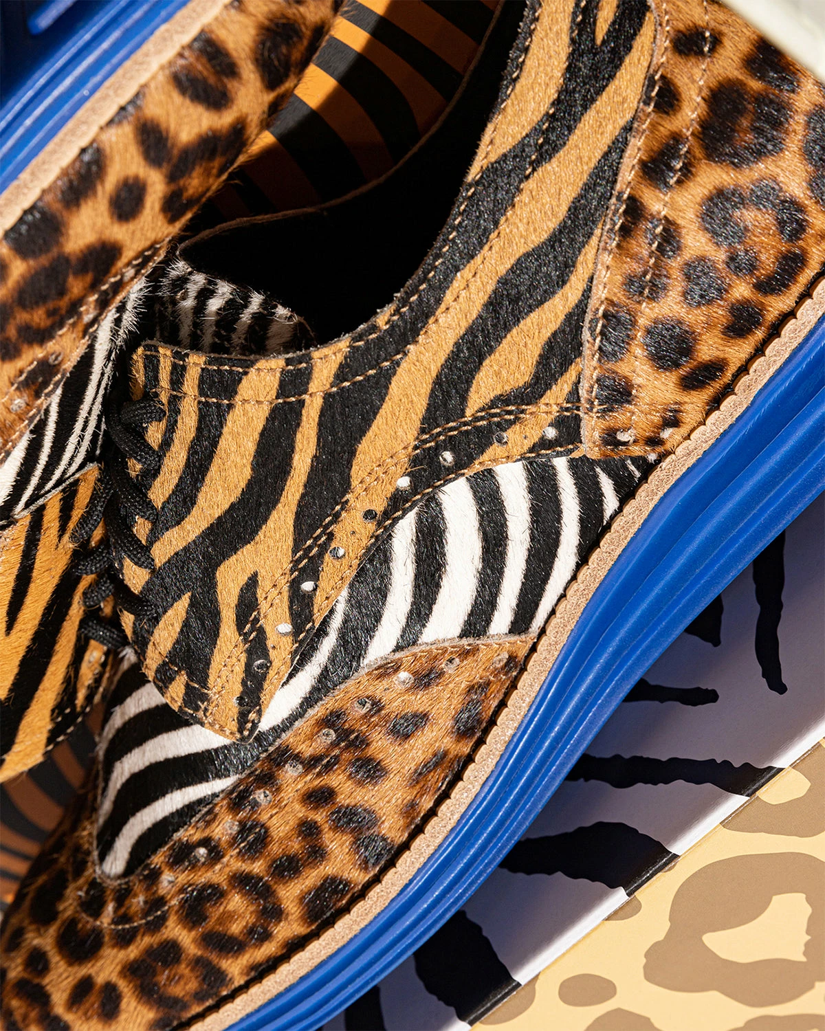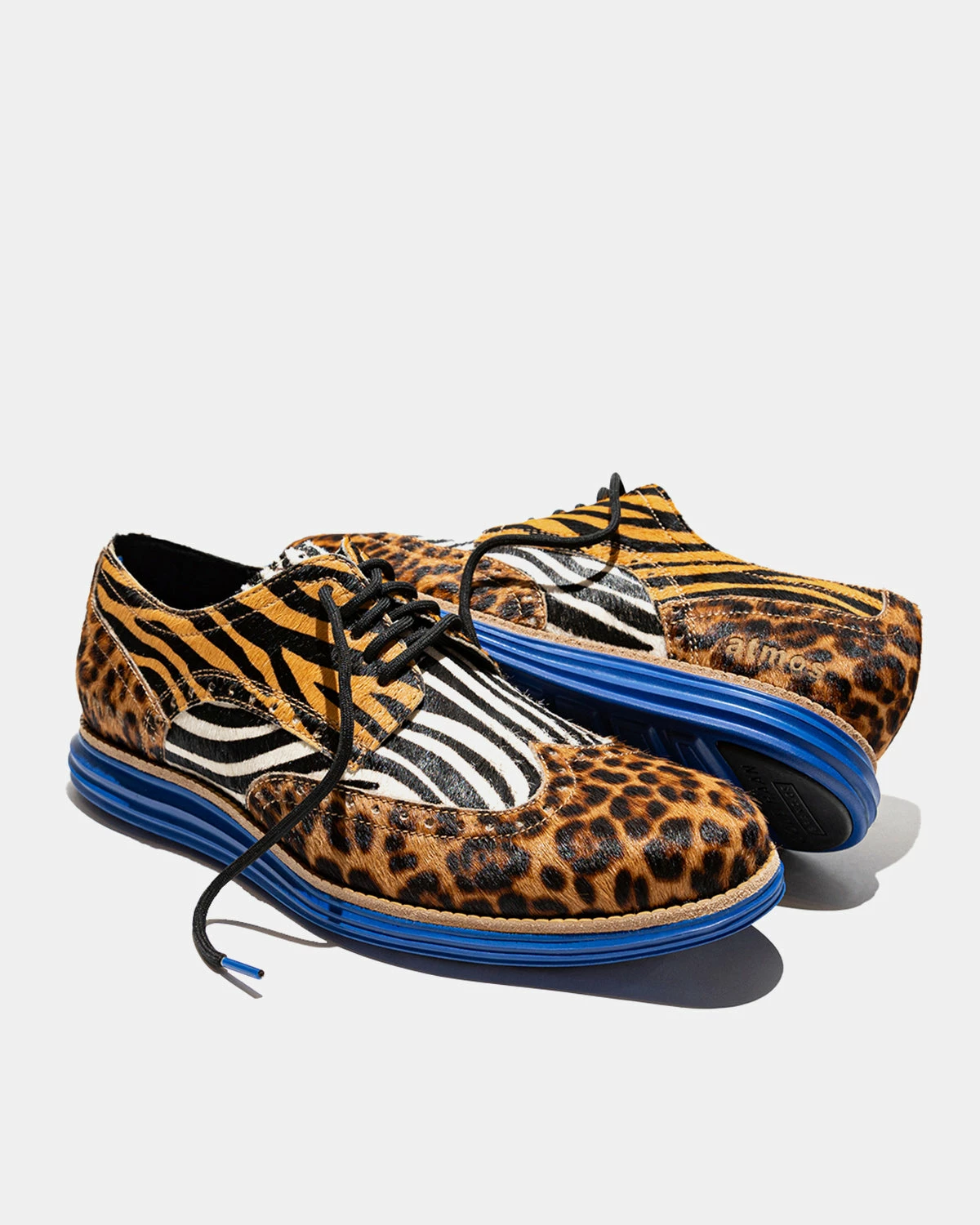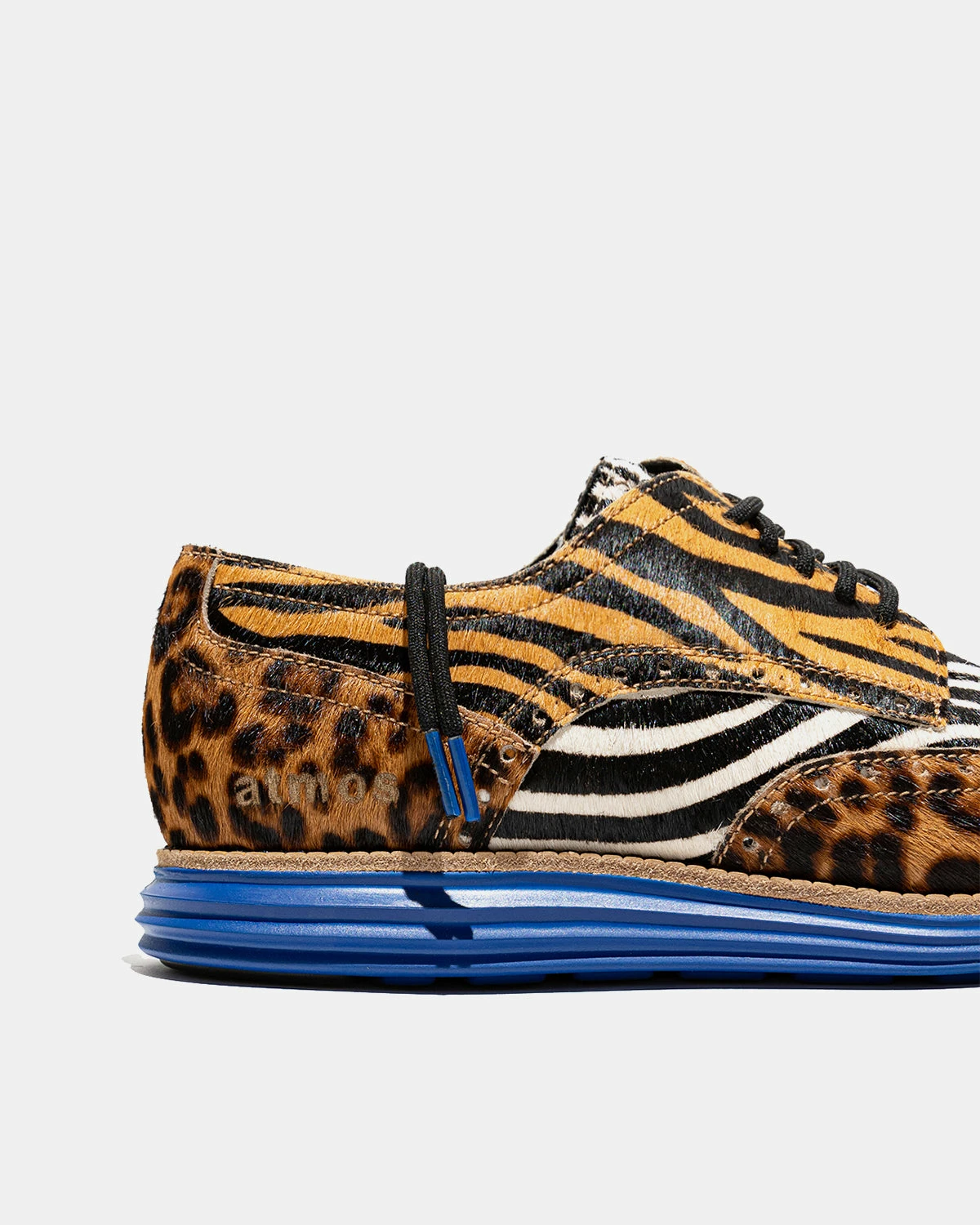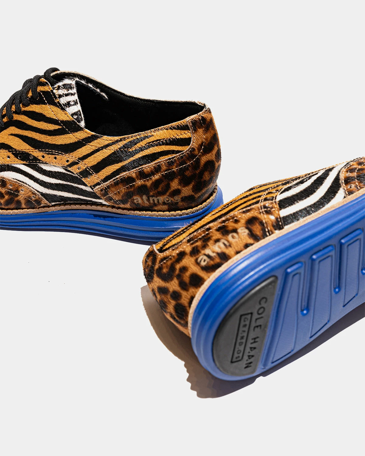 The atmos x Cole Haan ØriginalGrand ‘Instinct’ features a leather upper in a multi animal print, atop an atmos Blue rubber outsole. Other details include an embossed atmos-branded heel hit, and an additional pack of atmos Blue laces.