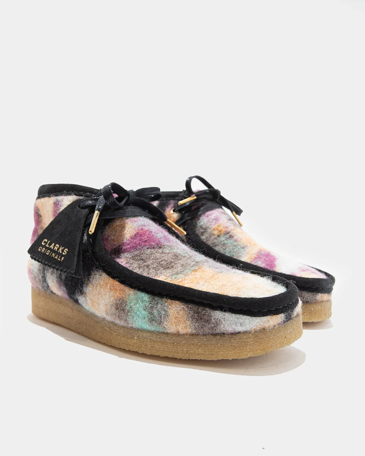 Woven from exquisite recycled Italian wool, our Paradise Garden-inspired Wallabee Boot has a colourful, tactile and consciously crafted finish. Black suede binding creates a striking contrast to the Wallabee Boot’s full yarn upper – while the natural crepe sole nods to timeless design.
