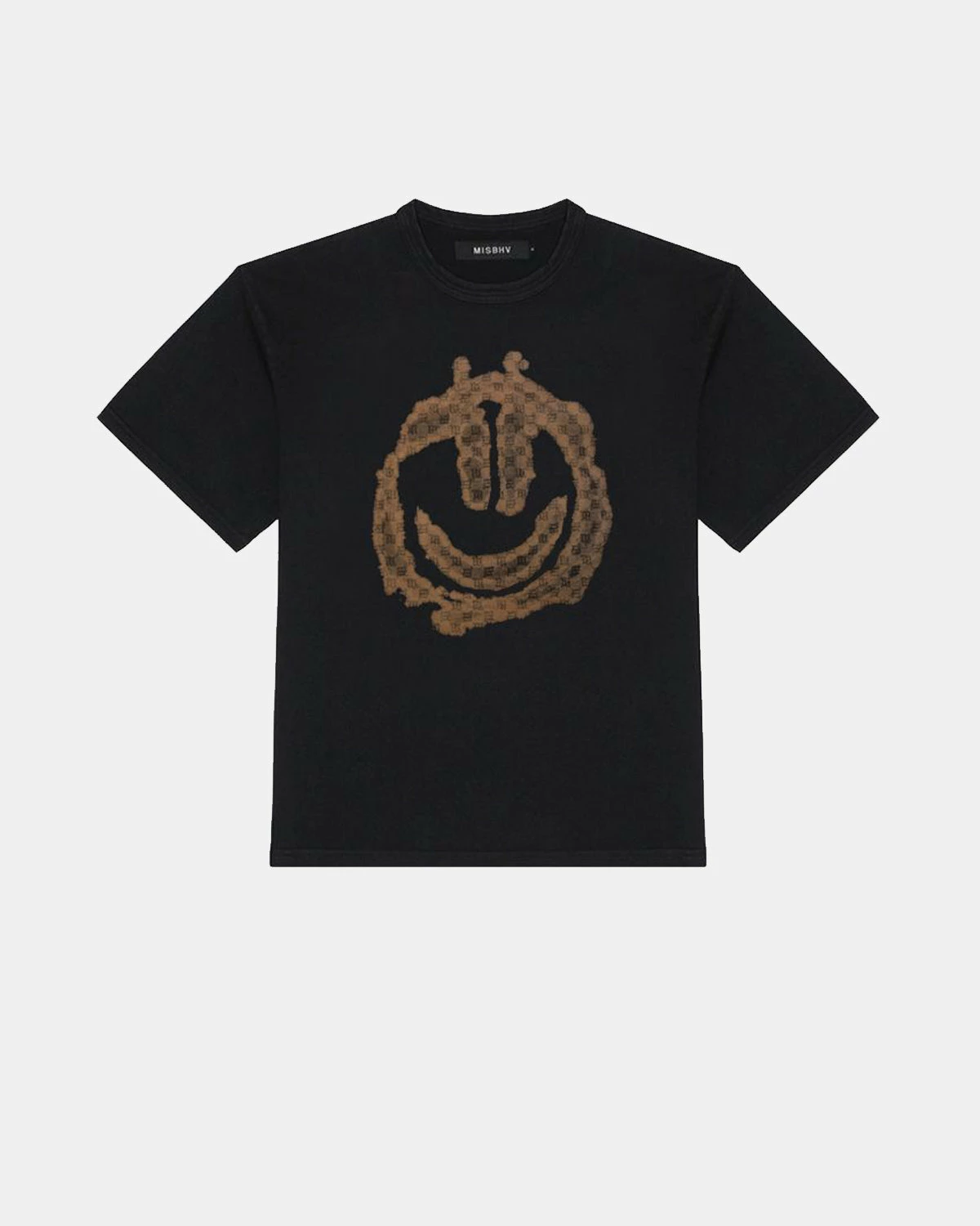 Short sleeve cotton jersey t-shirt in black. Rib-knit crewneck collar. Multicolor print at front and back. Tonal stitching.