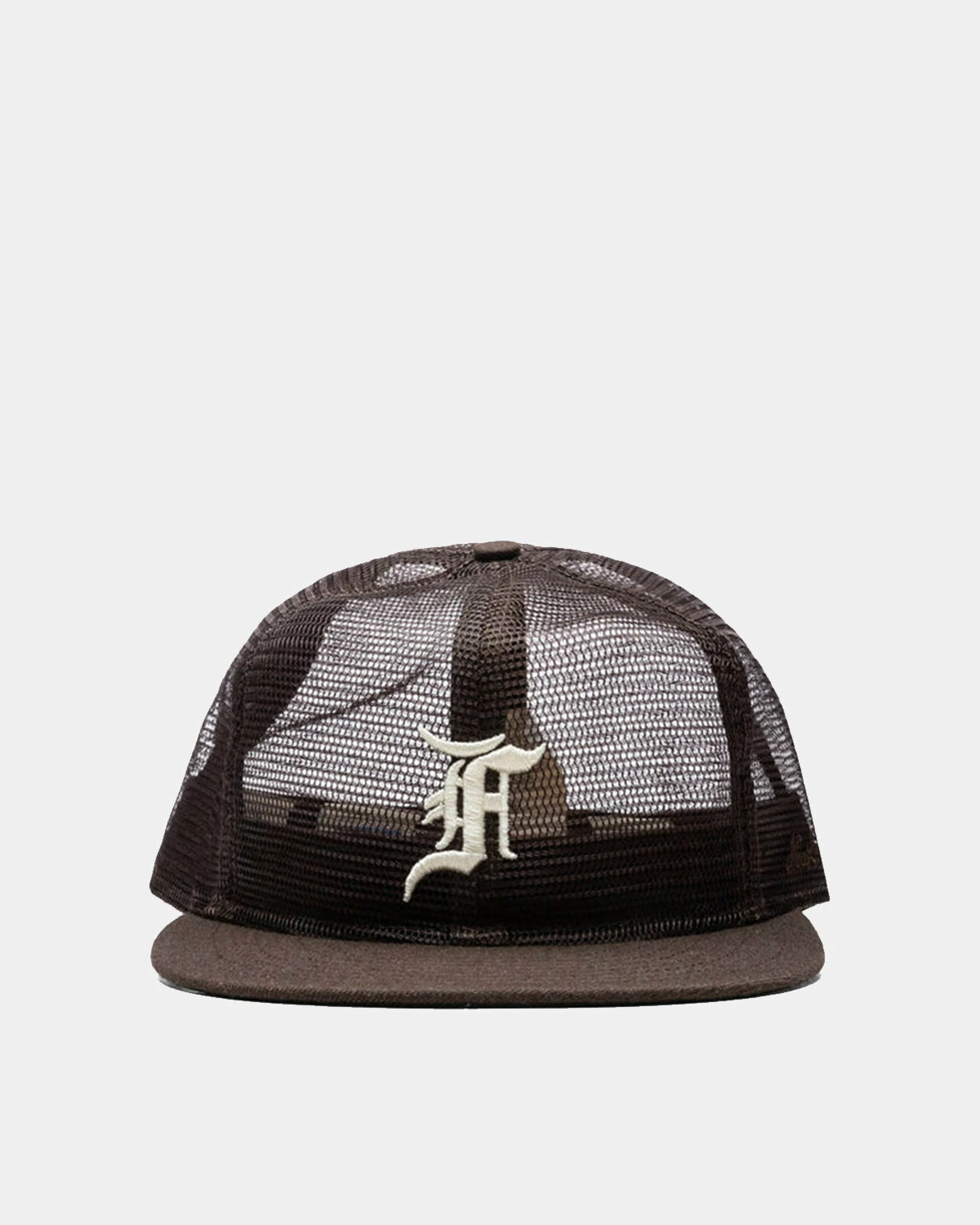 The Fear of God Essential Full Mesh Brown 59FIFTY Fitted Cap features an allover mesh crown with an embroidered Fear of God logo at the front panels, an MLB Batterman logo at the rear, and a green undervisor.