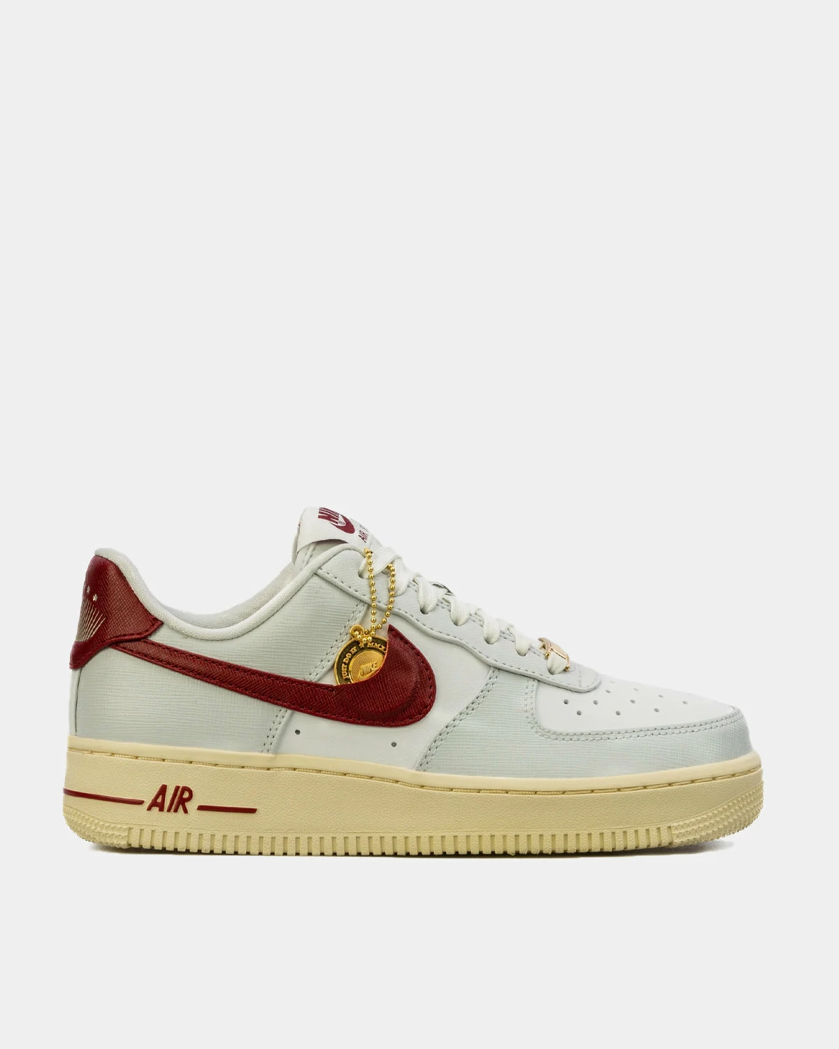 Dressed in a Photon Dust, Team Red, Summit White, and Muslin color scheme. This offering of the Nike Air Force 1 Low features a White leather base with Grey textile overlays and Team Red Swooshes and heels. Metallic Gold dubraes and hang tags with special branded insoles atop a Muslin AF1 rubber sole completes the design.