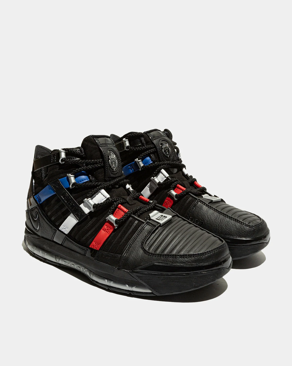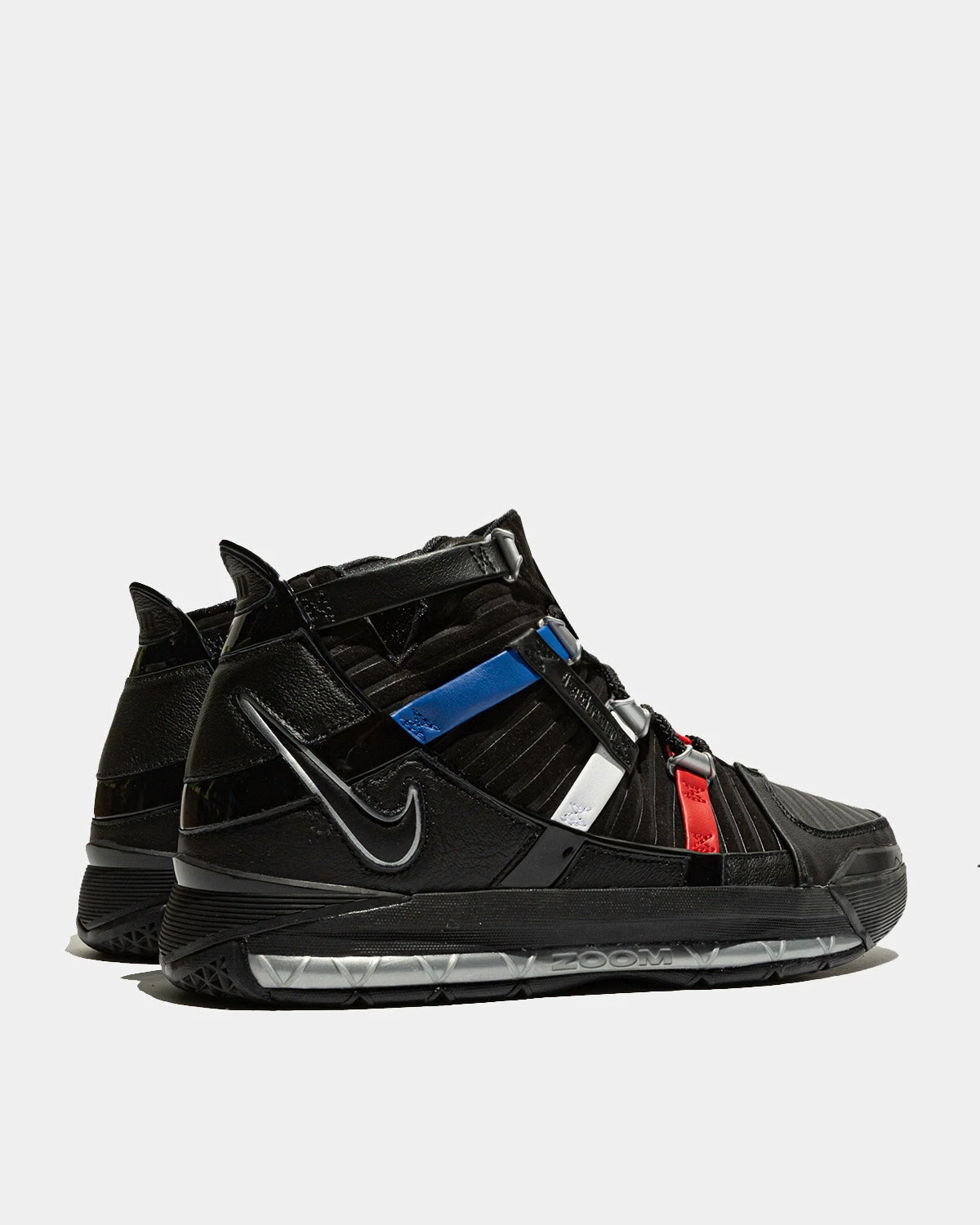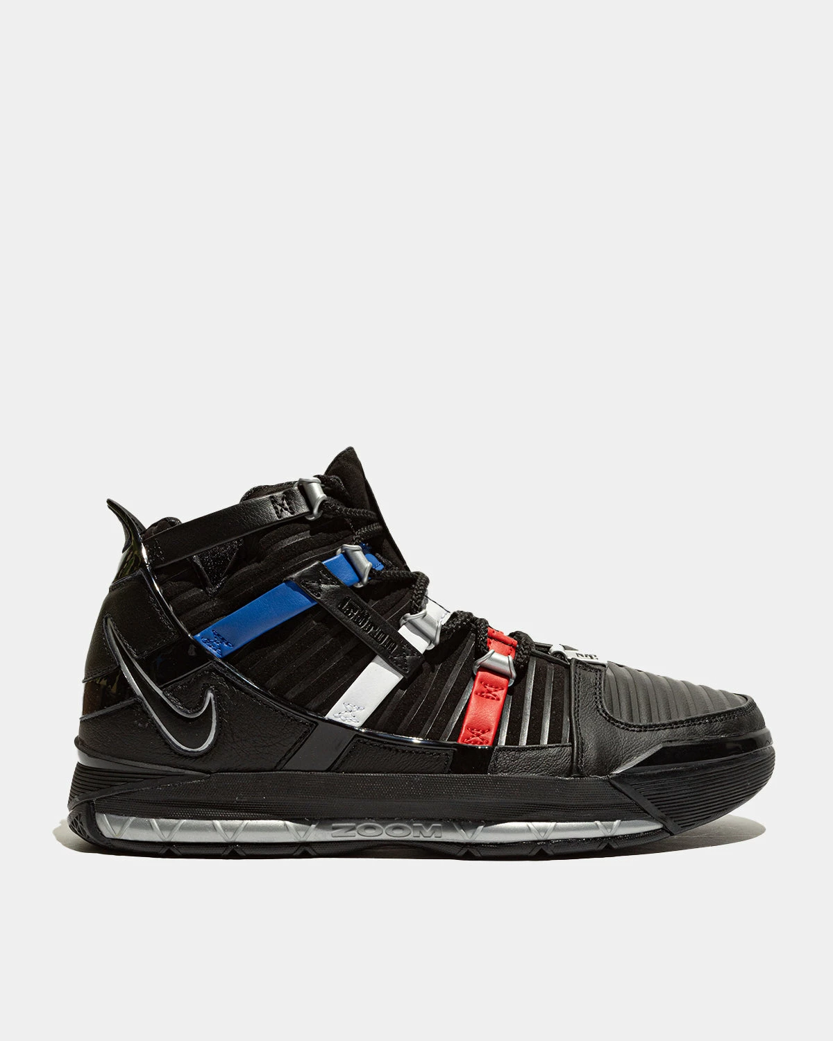 Stay sharp in the Nike Zoom LeBron 3. Classic red, white and blue accents celebrate those trusted barbershops that keep you looking fresh. Metallic details, nodding to the tools of the trade, polish your outfit. And finishing it off, Zoom Air cushioning delivers more comfort than a hot towel service. Trim & Clean The mixed upper will keep you looking sharper than a number 1 shave—thanks to a combination of durable leather, velvety nubuck and hits of polished patent leather.