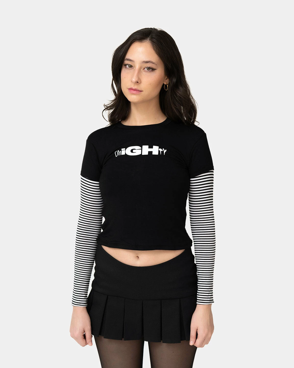 An obviously cool OMIGHTY logo, like cooler than all your other logo tees. This is a cropped baby tee with attached striped sleeves
