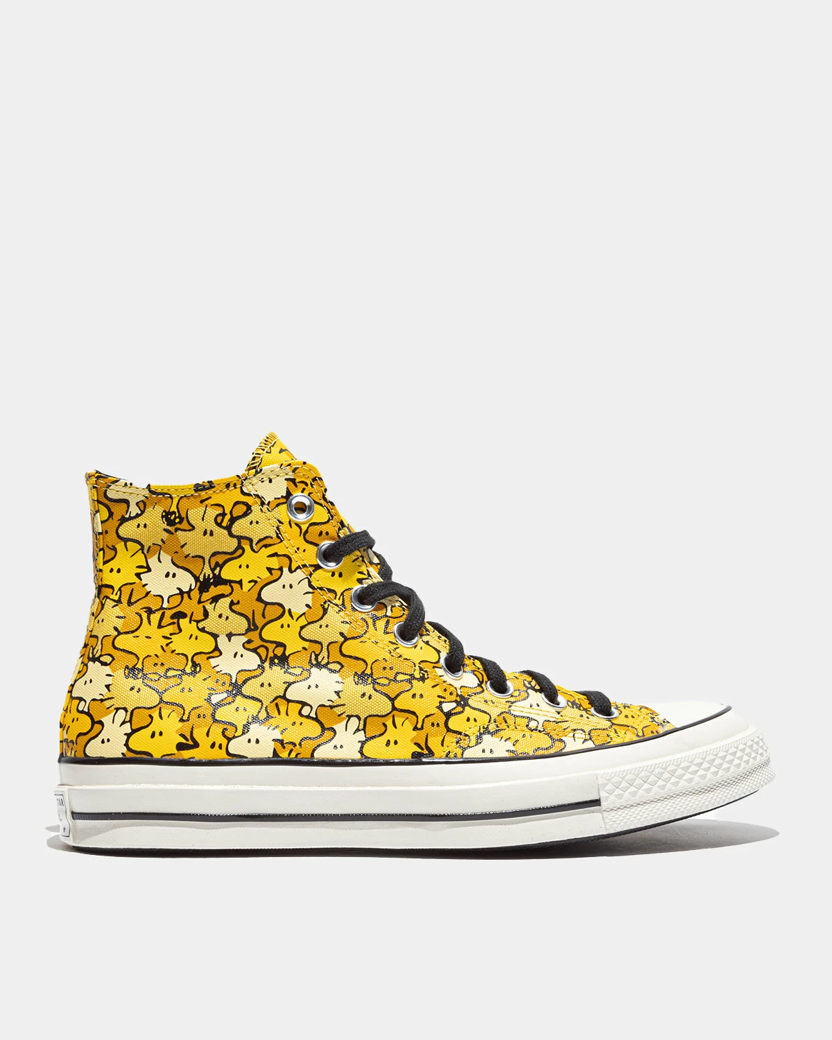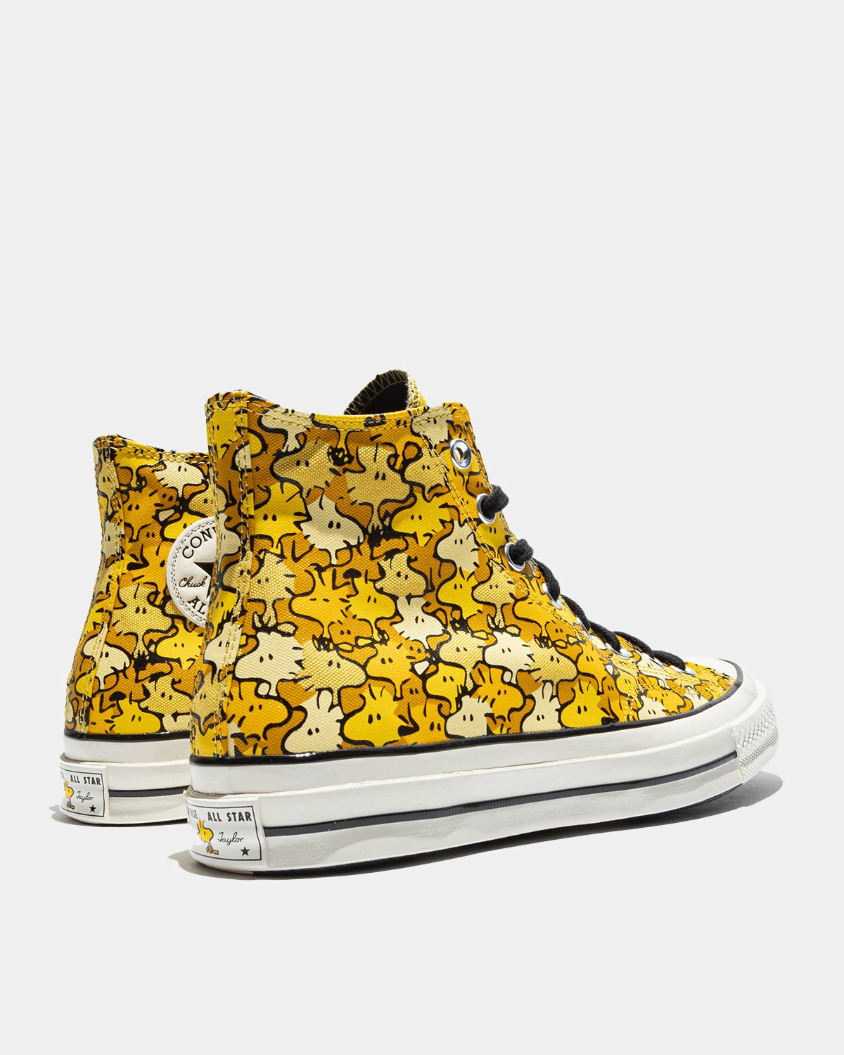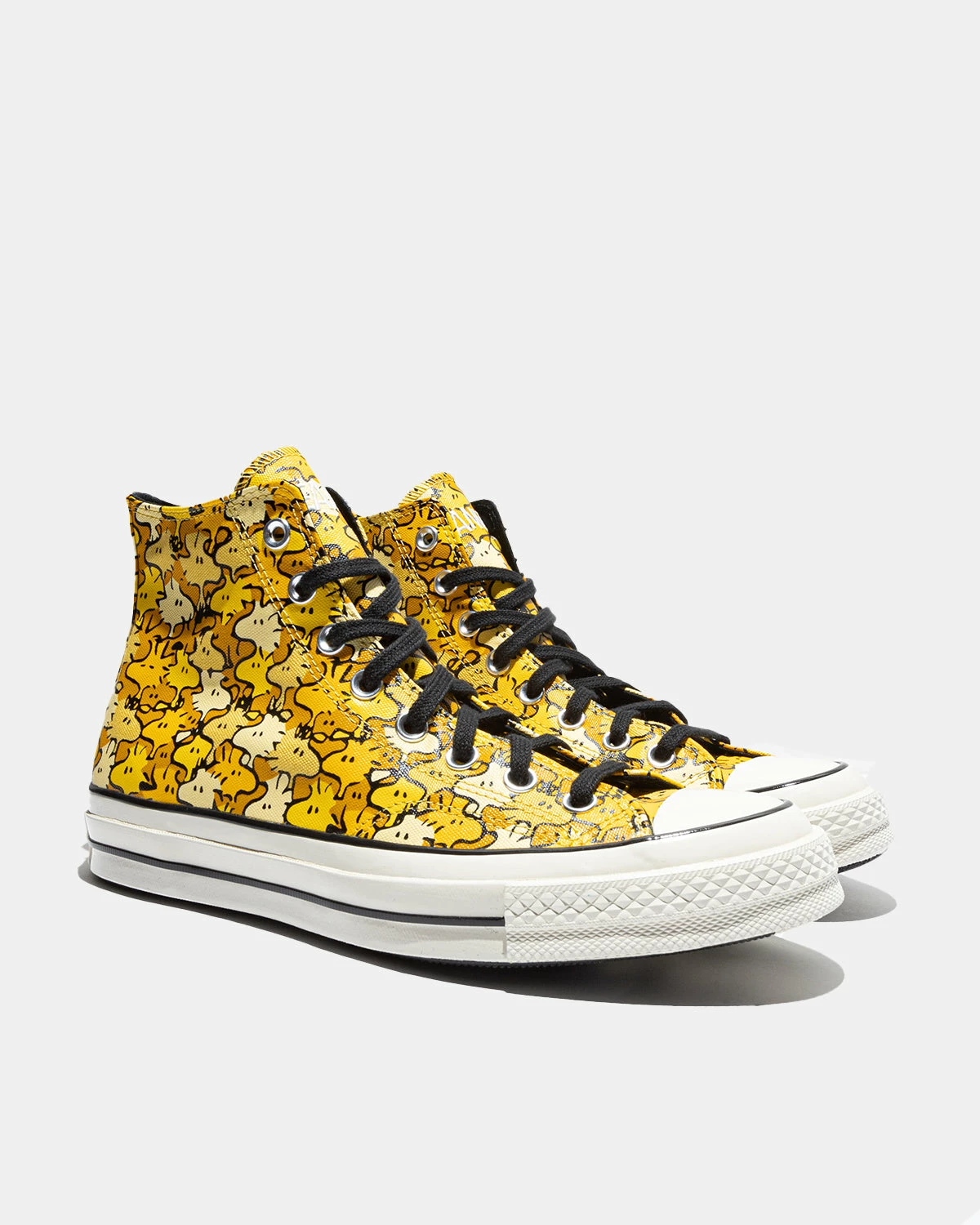 Converse teams up with the iconic comic strip to bring some lighthearted positivity to the world. On the premium Chuck 70, expert craftsmanship and classic style gets a playful twist with an all-over Woodstock camo print and custom details. Get nostalgic with the Converse x Peanuts Chuck 70.