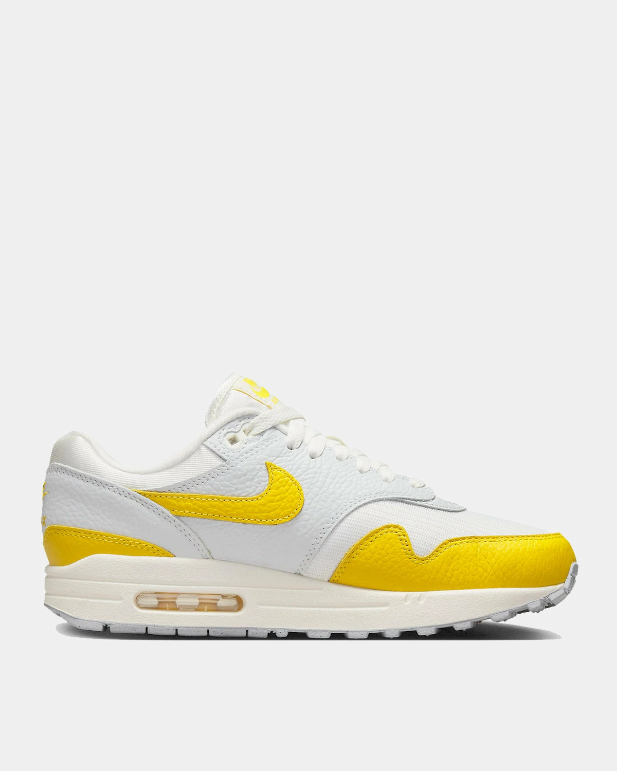Dressed in a Photon Dust and Tour Yellow color scheme. This offering of the Nike Air Max 1 features a White mesh base with tumbled leather overlays. Yellow branding, Swooshes, mudguards, and Air bubbles atop a White midsole and Grey speckled rubber outsole completes the design.